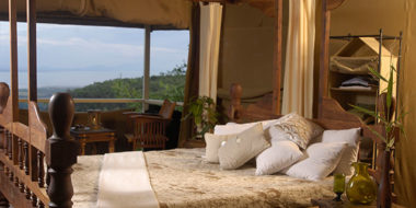 Große begehbare Zelte unter Reetdächern mit weiten, hölzernen Veranden bilden die Unterkünfte. Es werden zurzeit auch noch einige neue Zelte am Rande des Abhangs gebaut, die einen atemberaubenden Blick auf die Schlucht des Kirurumu River versprechen.